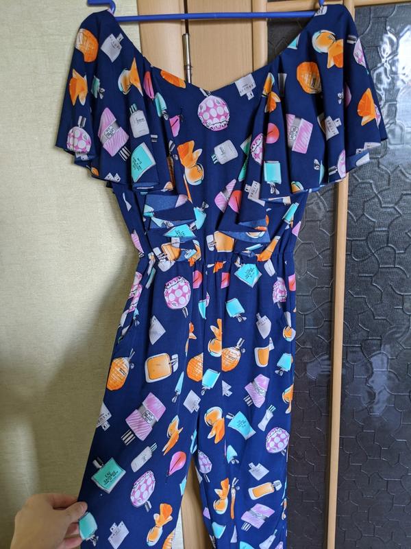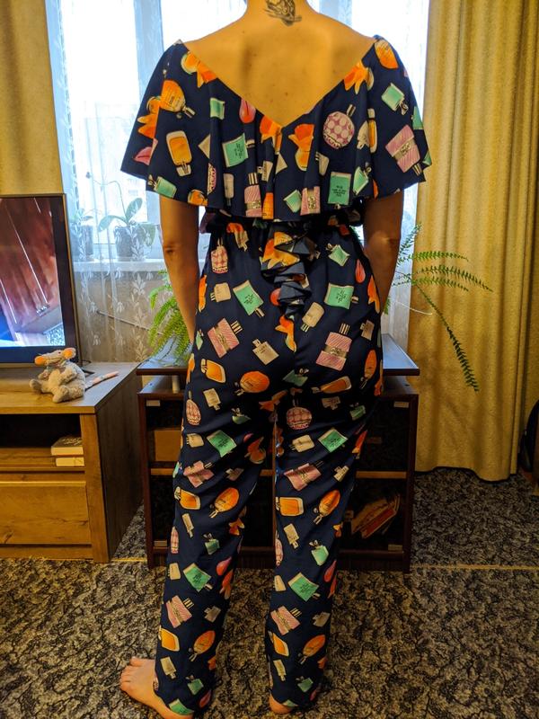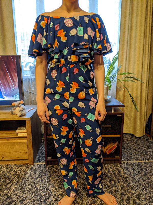 Очень красивый летний комбинезонКороткие рукава, длинные брюкиСпереди по груди и сзади воланы Есть карманы Талия на резинке Не мнеться Подойдет в качестве праздничного или вечернего наряда одевался пар раз