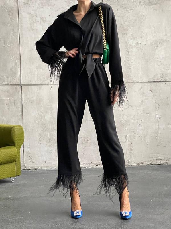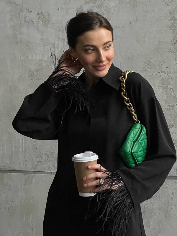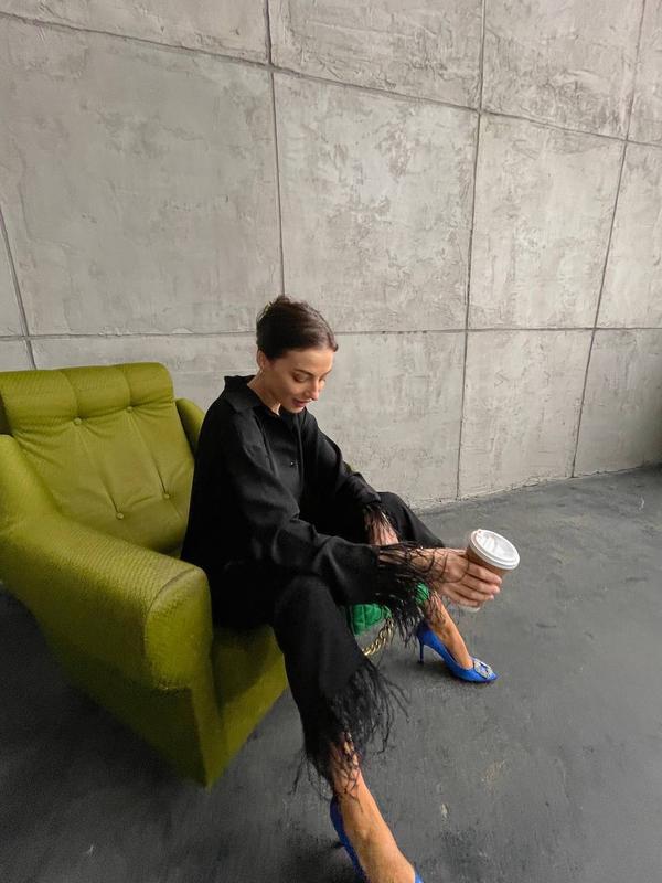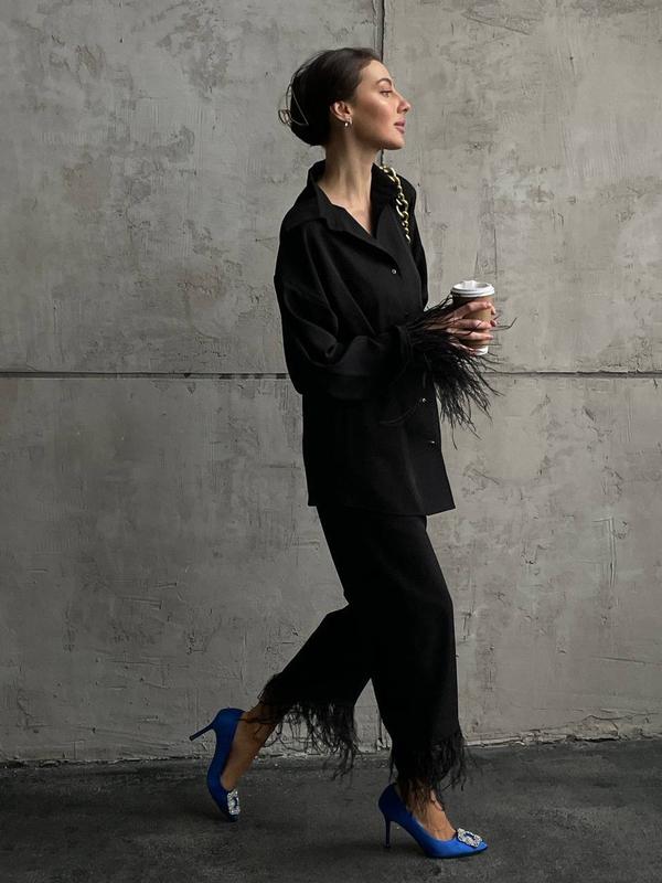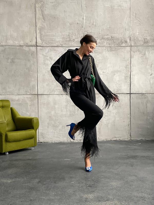 🧵Материал : итальянская костюмная ткань. (Плотный, шелковистый материал, гладкая структура, скользящий на ощупь). Брюки - высокой посадки (талевые) на резинке. Отделка - перья марабу,⠀📐Размеры: 42-46;48-52;54-56