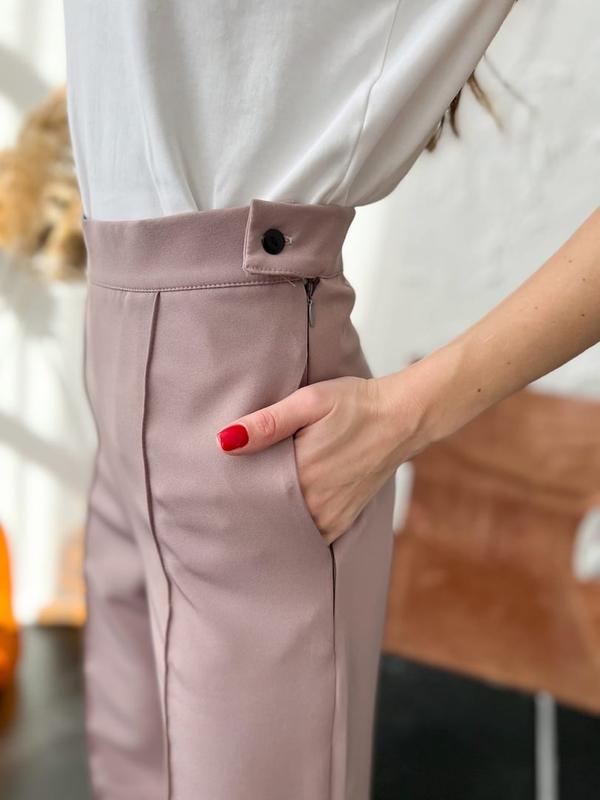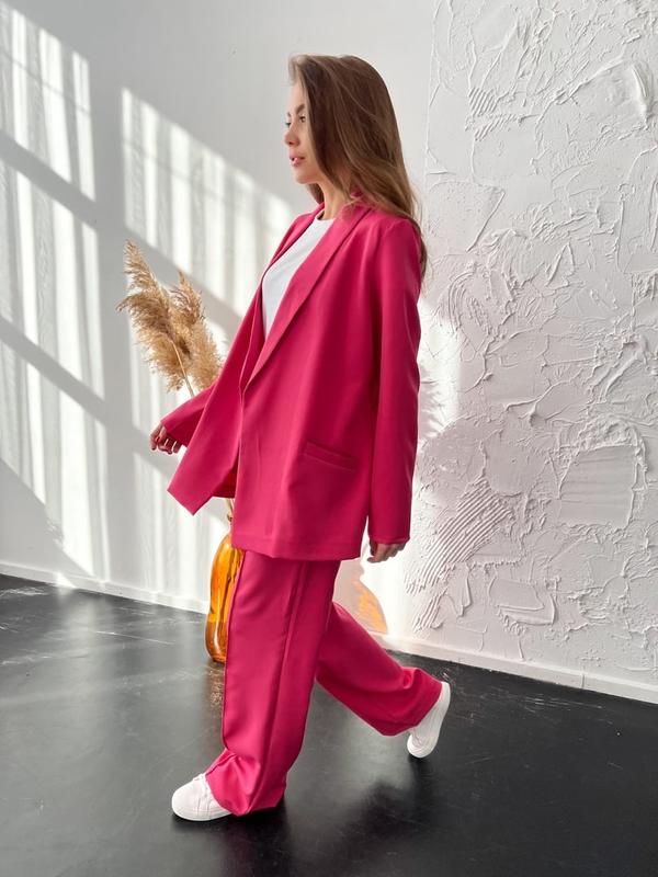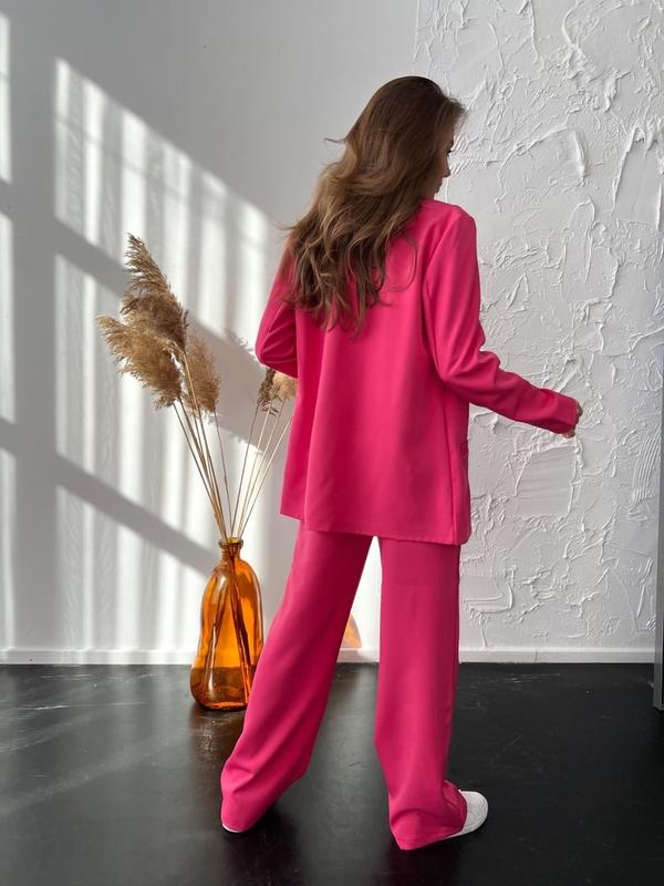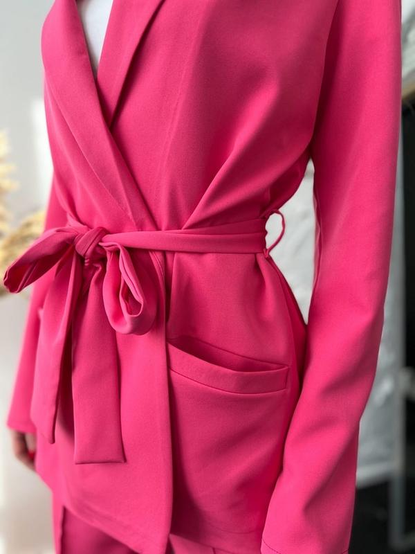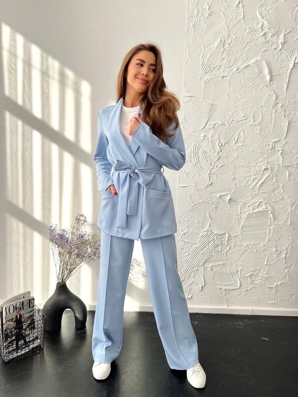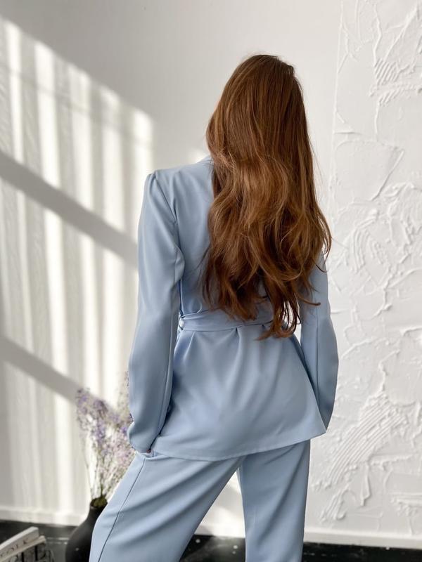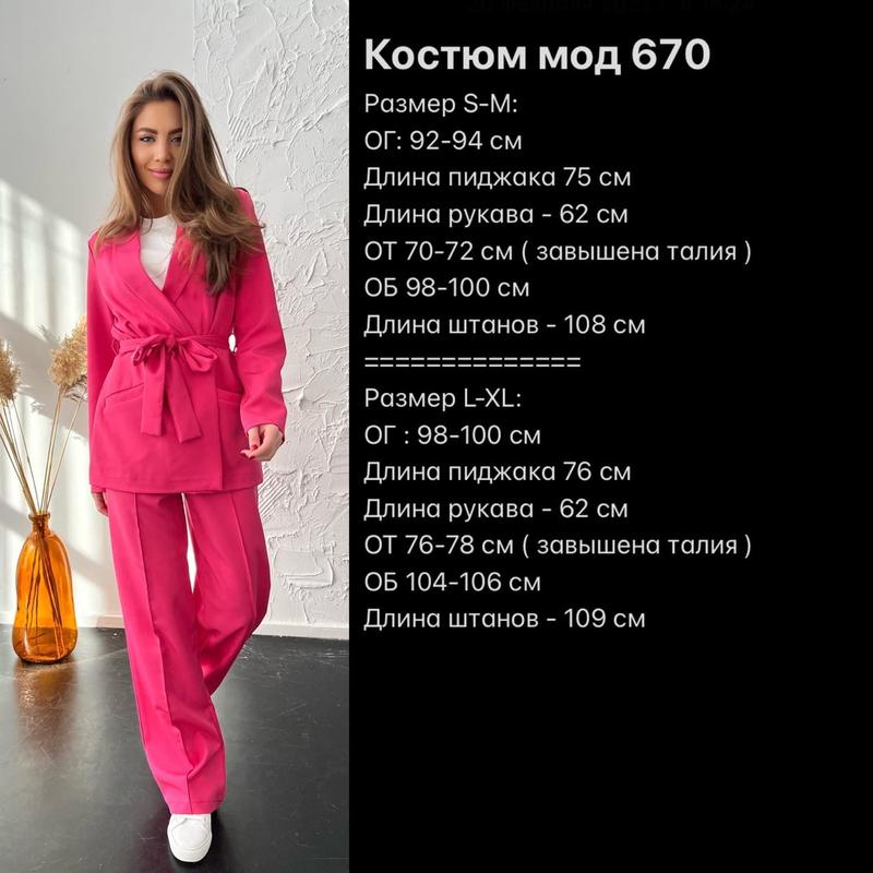 Длина пиджака 62 см. Тканевый пояс. Брюки застегиваются сбоку на молнию и пуговицу. Талия завышенная. Карманы по бокам. Длина брюк 108 см.