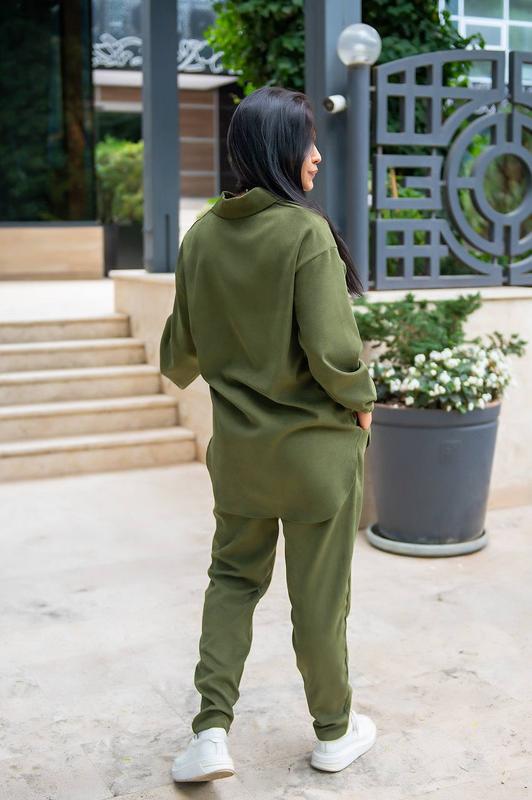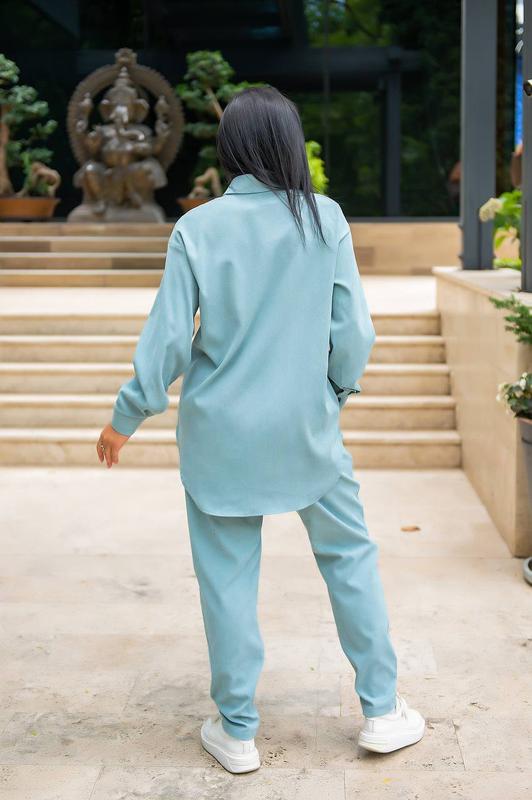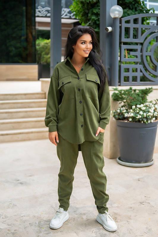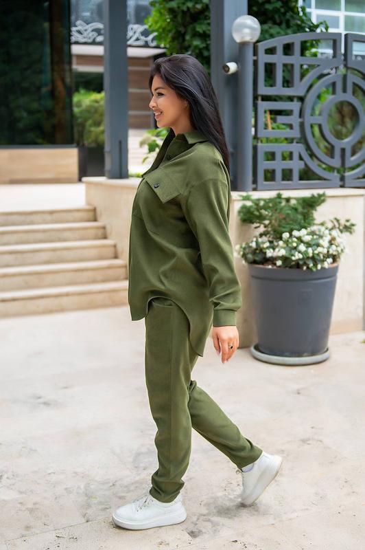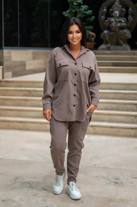 Удобный костюмчик двойка, рубашка с рабочими карманами, пояс на брюках на резинке, за счет чего есть запас в поясе. Высокая посадка брюк делает их мега комфортными