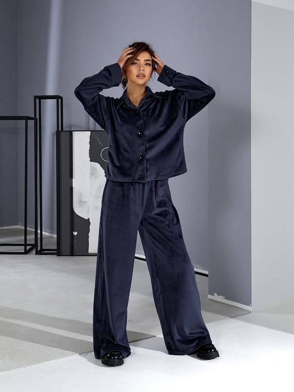 Стильный спортивный костюм.Свободная кофта на пуговицах.Широкие штаны с высокой талией. Очень мягкая и приятная ткань к телу. Модель:1444 Размеры:42-44,46-48 Цена:1200грн Ткань:королевский велюр Турция Люкс качество Расцветки:изумруд, сирень, бордо, черный, моко,т.синий