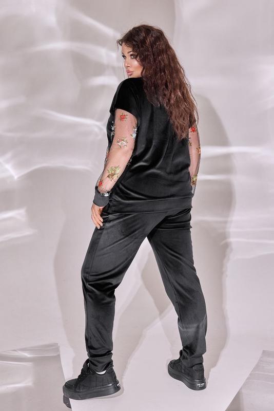 Брюки также из велюра, с манжетами по низу, посадка выше среднего, удобный шов сидения, пояс на резинке- просрочен на специальном оборудовании для хорошей фиксационной резинки, с карманами.