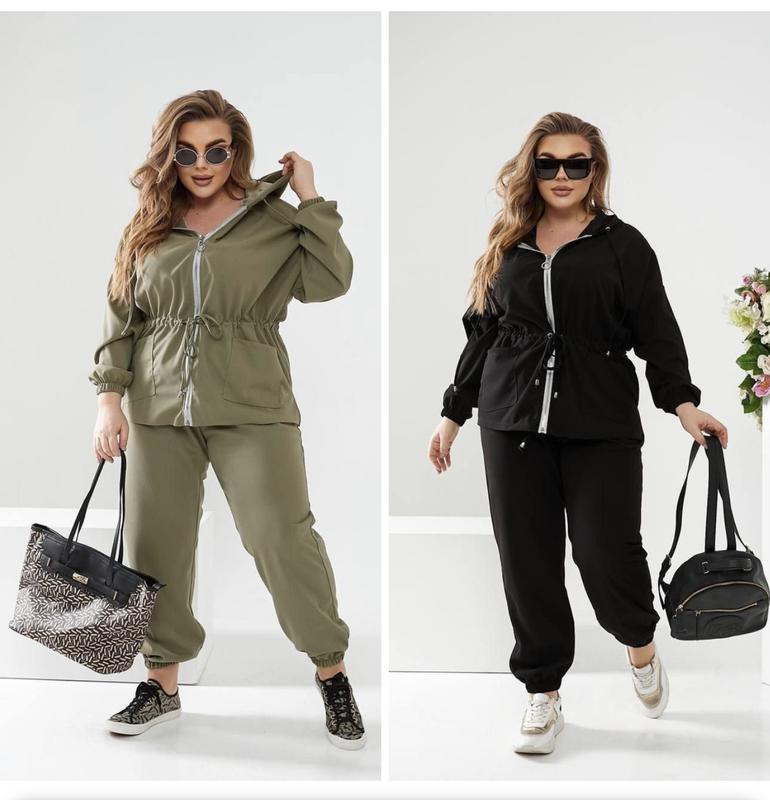 МАТЕРИАЛ:креп костюмный ЗАСТЕЖКА:на молнии СЕЗОН:весна/ лето СТИЛЬ:спортивный ПАРАМЕТРЫ МОДЕЛИ НА ФОТО:104-81-110 см РАЗМЕР МОДЕЛИ НА ФОТО:52 РОСТ МОДЕЛИ НА ФОТО:170 О ТОВАРЕ Женский костюм больших размеров. Ткань: креп костюмный. Размеры: 50-52; 54-56 Ориентировочные измерения готового изделия: 50-52 размер О/Г—124 см Дл. Бомпера: 71 см Длина рукава от горла: 75 см Дл.Бомбера: 71 см Брюки: Длина: 105 см. О/Б—120 см 54-56 размер О/Г-132 см Длина рукава от горла: 76 см Дл. Бомпера: 71 см Брюки: Длина: 105 см. О/Б—-128 см