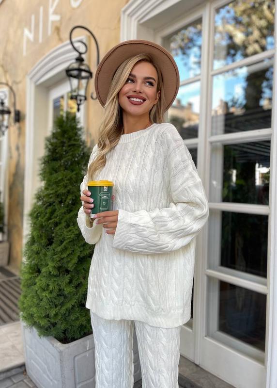 Костюм выполнен из трикотажного материала. Модель кроя oversize с свиттером и широкими брюками с высокой посадкой на талии. Такая вещь незаменима для комфортных расслабленных образов на холодный период года. • Размер: универсальный Оверсайз Цвета: бежевый, мокко, черный, белый, зеленый Замеры Длина брюки 108-110 см Длина свитера 71 см (по спинке) Длина рукав 76 см (от шеи) Ог 120 см От 60-80 см Об 80-110 см 8004