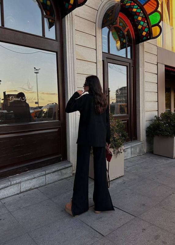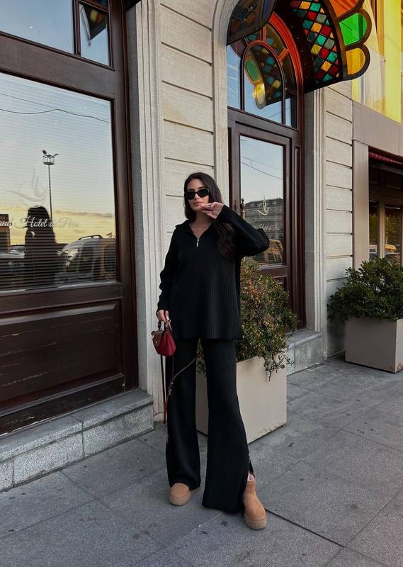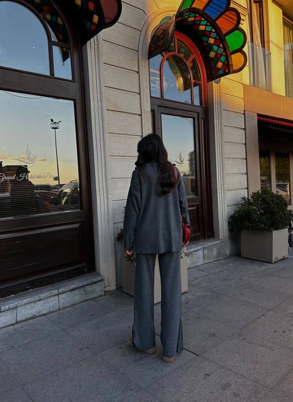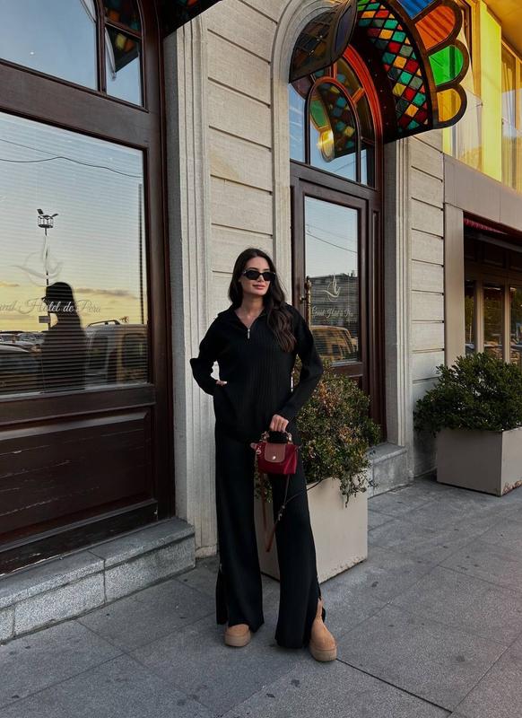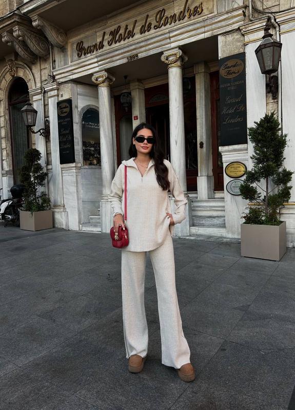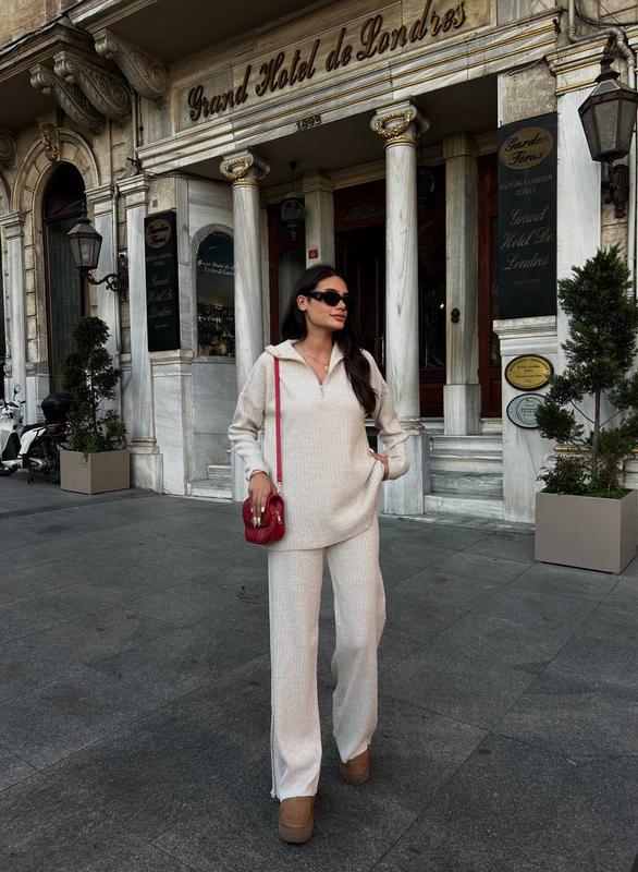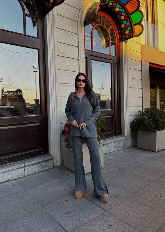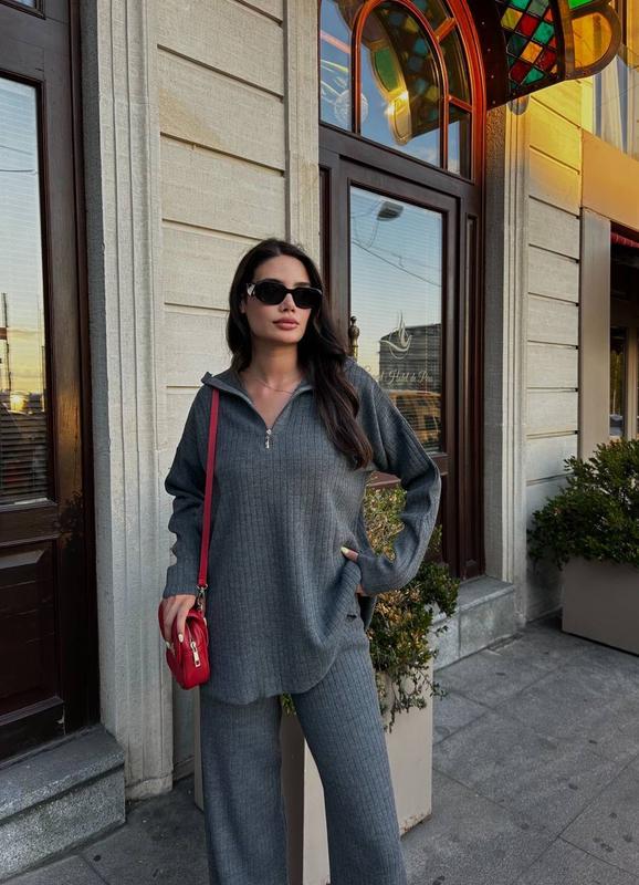 Костюм выполнен из трикотажного материала. Модель кроя oversize с джемпером и широкими брюками с высокой посадкой на талии. Такая вещь легко сочетается с массивными ботинками или кроссовками, а поверх вы сможете накинуть стильное пальто или тренч, завершив образ.