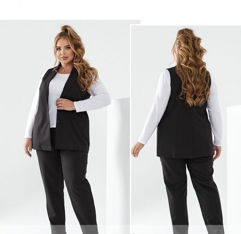 Брючный костюм с удлиненным жилетом, который отличается лаконичностью и привлекательным дизайном. Такой костюм сейчас используют не только для классических образов, а также создаются яркие женственные образы для прогулок. Жилет с воротником и двумя накладными карманами на уровне талии. На груди есть имитация кармана, а застегивается изделие на две функциональные пуговицы. Для создания утонченного силуэта мы сделали две вертикальные вытачки от карманов. Брюки классического кроя с резинкой на талии и боковыми карманами.