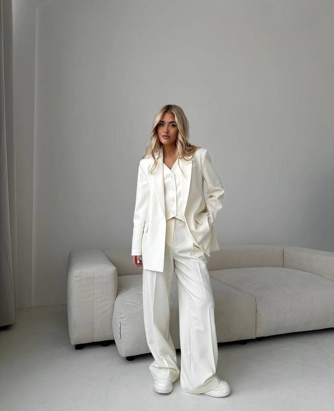 Мш 25.02 Новинка🖤 Костюм тройка (пиджак+жилет+брюки) ✨ Модель 10/2/31 ▪️Размер: 42-44, 46-48 ▪️Тканина: костюмка ▪️Цвет: черный, молочный Жакет без подкладки, с плечиками. Брюки высокой посадки, на резинке сзади, с боковыми карманами. Модель ❤️42-44 Пиджак Объем груди 100 см Длина 75 см Длина рукава 64 см Жилет Объем груди 86-92 см Длина 42 см Брюки Объем талии 64-68 см Обʼєм стегон 88-94 см Длина 105 см ❤️46-48 Пиджак Объем груди 106 см Длина 75 см Длина рукава 65 см Жилет Объем груди 90-95 см Длина 42 см Брюки Объем талии 70-76 см Объем бёдер 90-98 см Длина 105 см В2В
