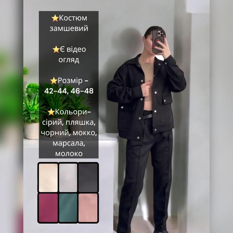 ▪️Костюм ▪️Мод. 196 ▪Размер - 42-44, 46-48 ▪️Ткань – замша на дайвинге – очень хорошего качества! ▪️Цвета - серый, бутылка, черный, мокко, марсала, молоко Есть видео обзор