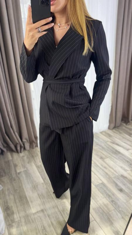 Костюм жакет без подклада, на запах, пояс пришит. Брюки посадка средняя, свободного кроя, сзади на талии резинка, застегиваются на молнию и пуговицу