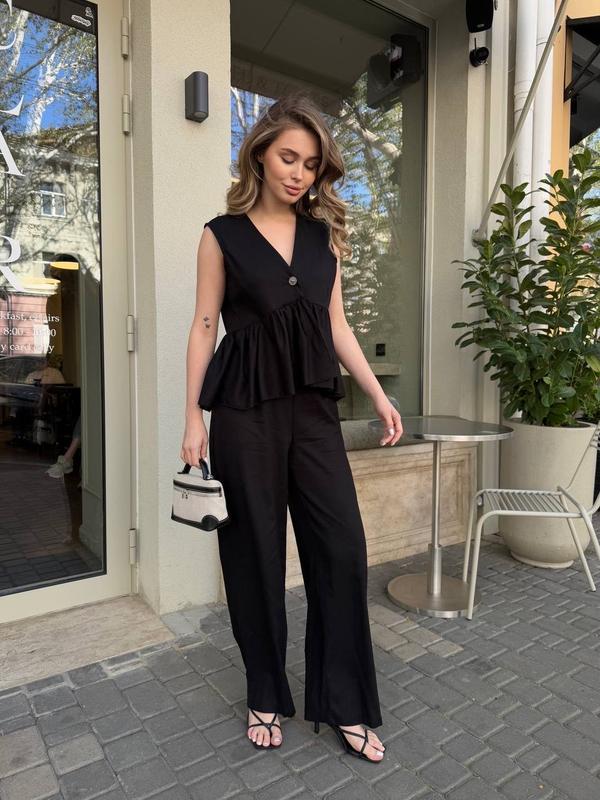 Лляний костюм блузка і брюки чорний, блакитний, барбі