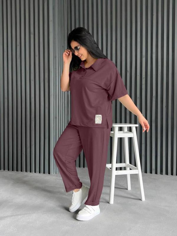 Комфортный прогулочный костюм из двунитки: брюки и футболка. Брюки имеют два кармана и отделаны манжетом, пояс на резинце. Футболка украшена нашивкой и двумя разрезами по бокам, рукав спущен, горловинка застигивается на кнопки и имеет отложной коморец.