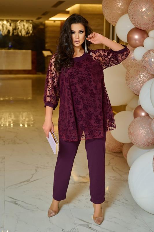 Костюм "Розы" с туникой из ажуной сетки, кроя - трапеция мод ИТ-1194 Размер: 58-60. Цвет: бордо Ткань: креп-дайвинг, сетка флок. Брючный комплект. Блуза свободного кроя. Блузка со сборкой по горловине, оформленной декоративной планкой. По спинке средний шов. Рукав реглан. По низу рукава манжета. Брюки классического кроя, немного заужены к низу, на резинке. Это безупречный выбор современной модницы! Замеры: Размер 58-60. Блуза 90/80 см. ОГ-60 см. ОТ 70, ОБ 80 Штани 107 см, Ос-65