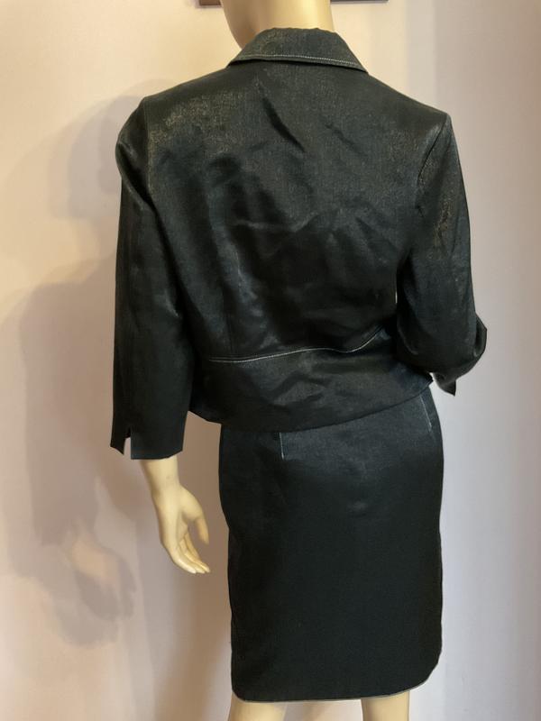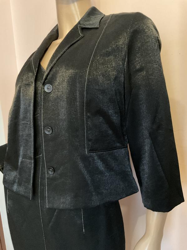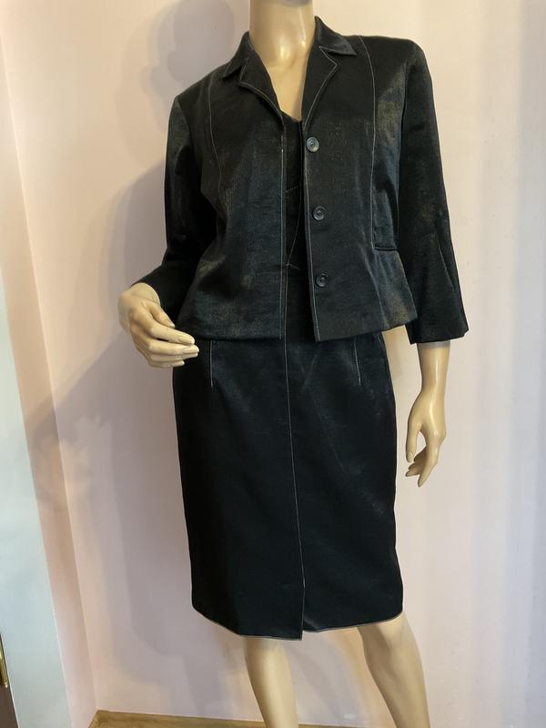 Стильний сучасний комплект з легким блиском. Сарафан М- жакет- S. Лежить ідеально. Жакет без підкладки, плаття на підкладці. Стан нового . Жакет в грудях 48см в талії 42см в бедрах 46см невеликі розрізи . Довжина 50 см в плечах 36см рукав48см . Плаття в грудях 45см в талії 35см в бедрах 47см довжина від бретелі 97см