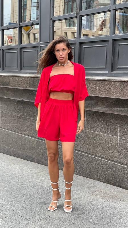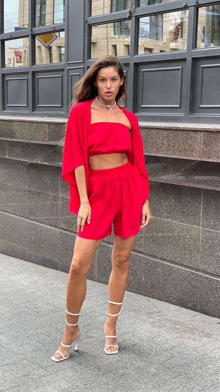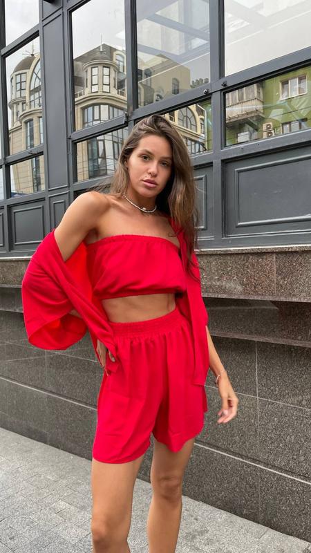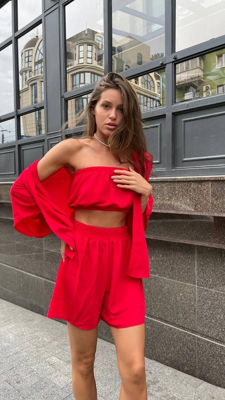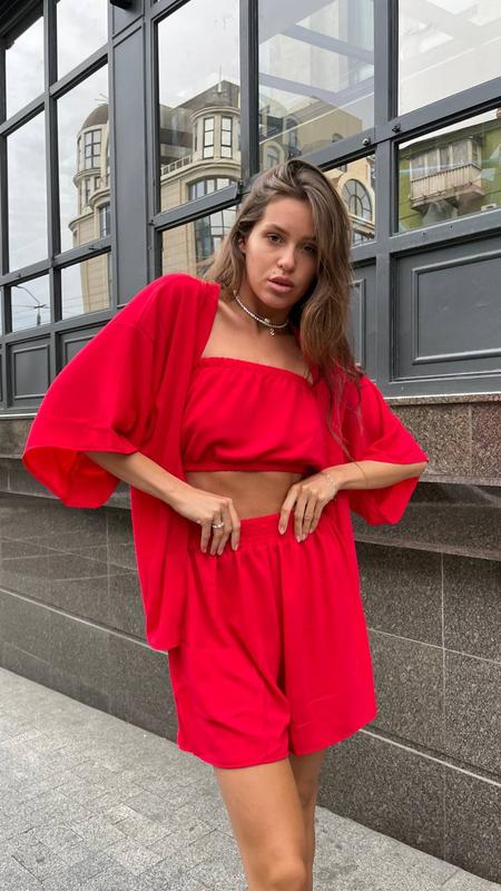 Шорты, топ, кофта кимоно. one size Тканина креп-шифон Кофта от плеча 70см Шорты 43 см талия 64 до 86, по бедрам расклешенные 115см. Отправка после оплаты, новой почтой, 1-3 рабочие дни после дня оплаты