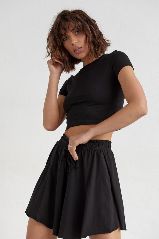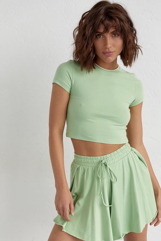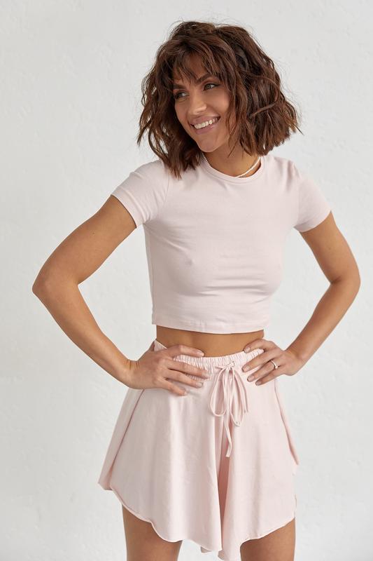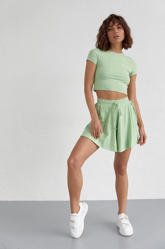 Молодежный костюм с шортами и укороченной футболкой из трикотажа.
