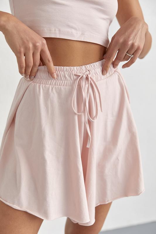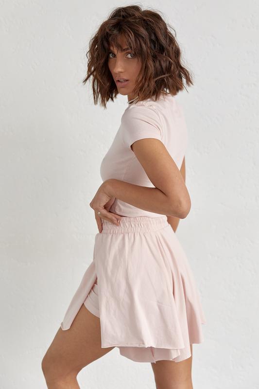 В комплекте короткие шорты состоят из двух частей – коротких велосипедок, которые спрятаны под широкими шортиками с боковыми разрезами.