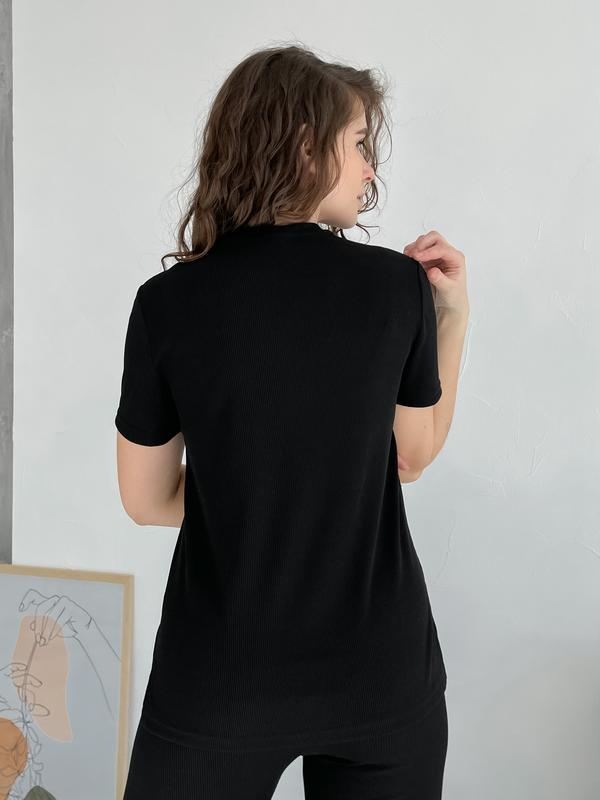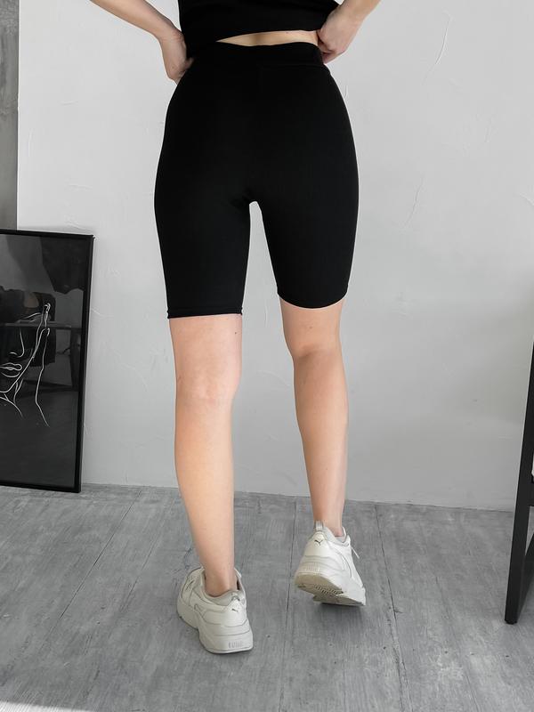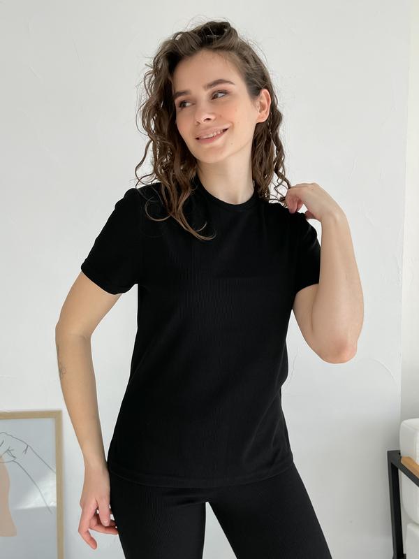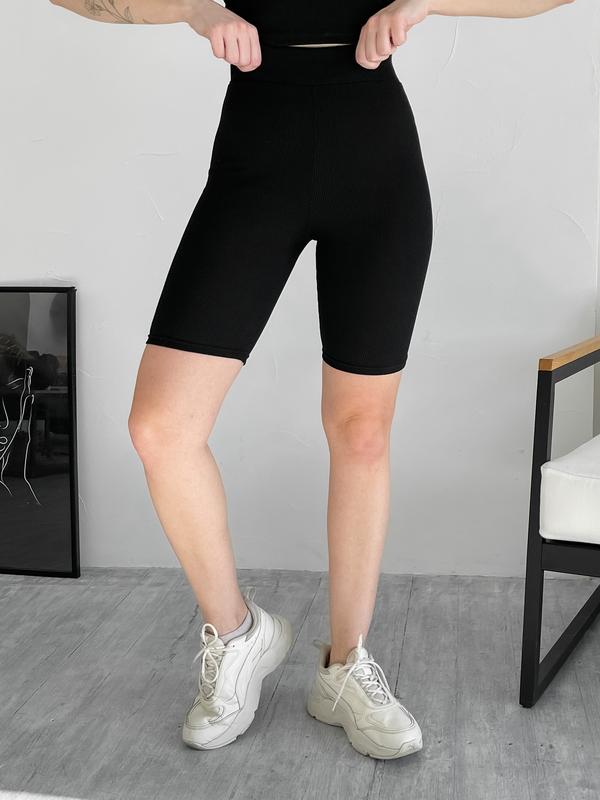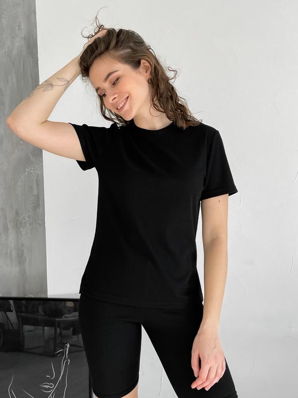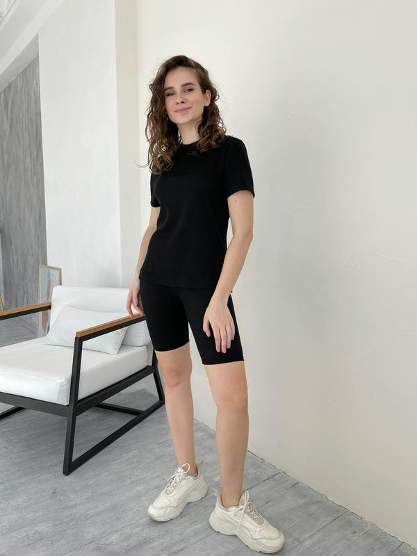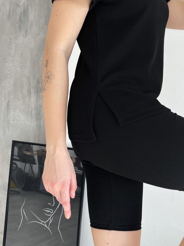 Комплект в рубчик. Женские велосипедки с высокой посадкой. Швы укреплены силиконом. Футболка в меру свободна сзади длиннее спереди короче. Ткань хорошо тянется.