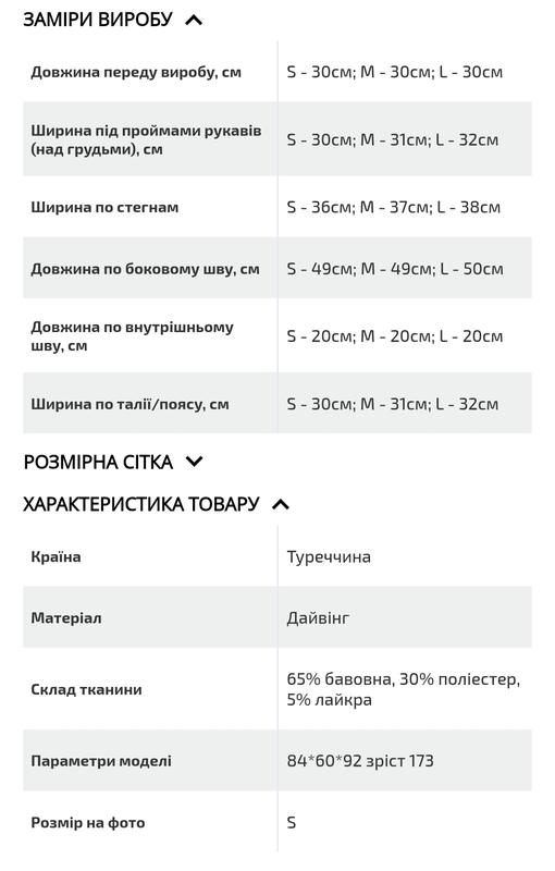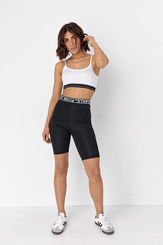 Модель сшита из эластичной ткани. В шортах края низа прямые, а вверху вшита широкая резинка, украшенная надписями. Короткий топ без рукавов также идет с резинкой внизу, а края закругленной горловины и пройм обшиты окантовкой в тон.