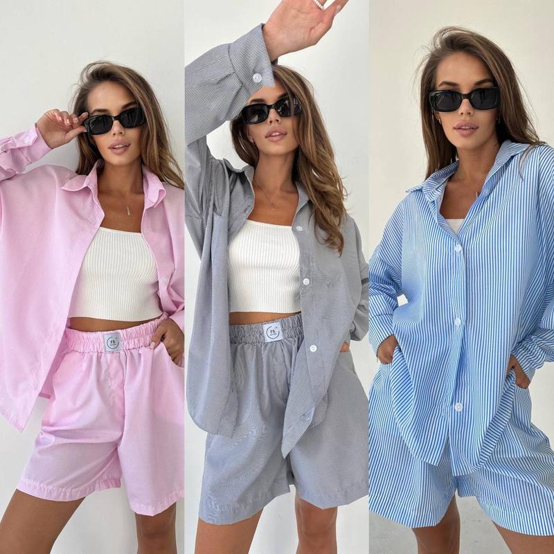 🩵Новинка 📸 Фото Реал Костюм Новая цена 750 грн ▫️Модель: 390 ▫️Цвет: белый, голубой в полоску, серый в полоску и разовой в полоску. ▫️Тканина: Коттон ▫️Размеры: 42-44, 46-48 Легкий костюм неизменная вещь в твоем летнем гардеробе 🕊️ Рубашка оверсайз и шорты на высокой посадке 👌🏼6