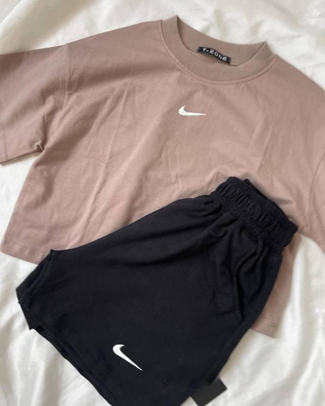 Костюм спортивный женский бежевый оверсайз футболка черные шорты на высокой посадке...