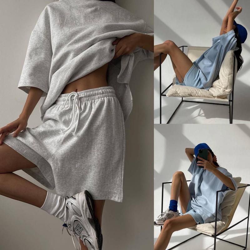 590 Кольори: - меланж - блакитний - чорний - бузковий Розміри: 42-44, 44-46, 48-50 Тканина: двохнитка люкс Колір: сірий, блакитний, чорний, бузковий Вигідна пропозиція Довжина шорт 45см, довжина рукава 43см, довжина футболки 64см