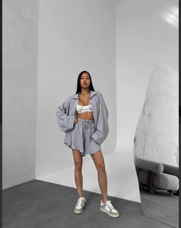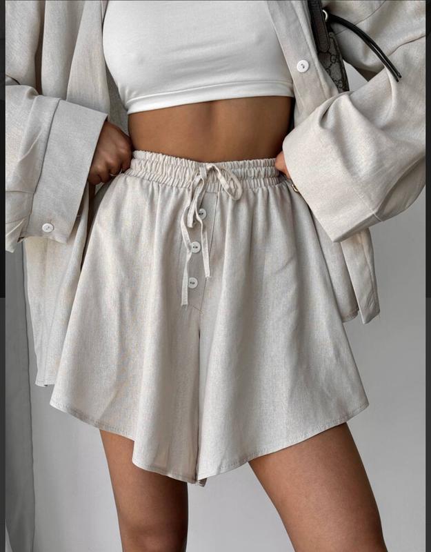 Очень удобная и практичная, рубашка свободного кроя на пуговицах, шорты на резинке декорированы пуговицами????
