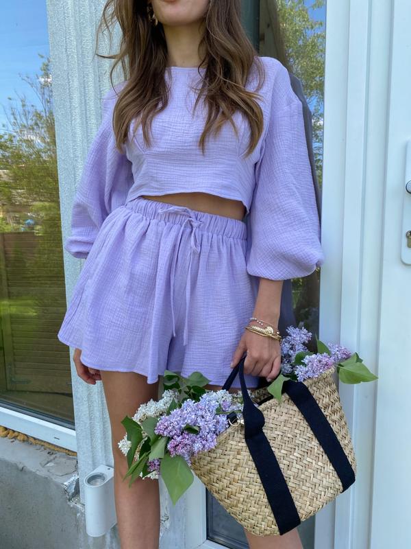 Укорочений топ із рукавами та шорти-спідниця із кишенями