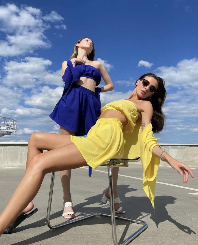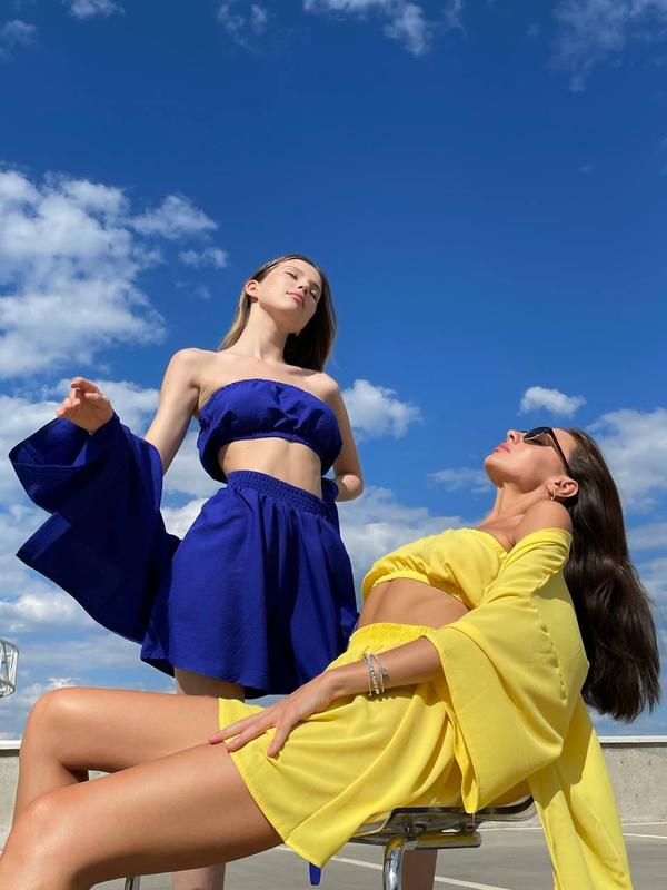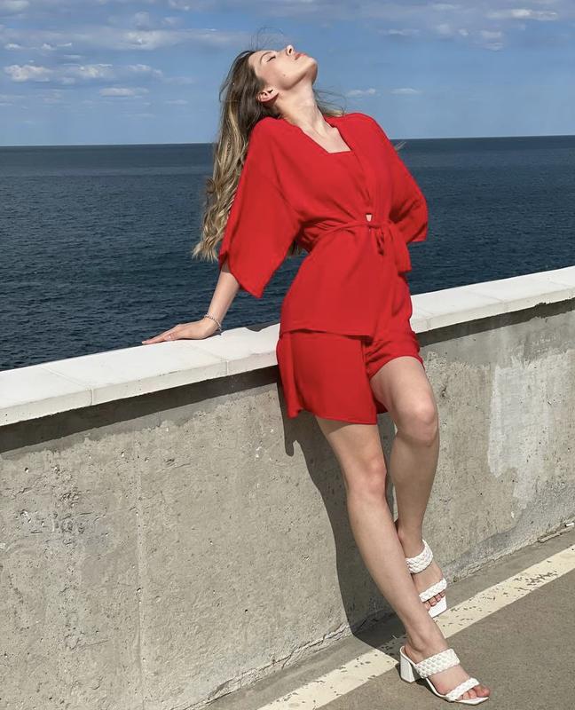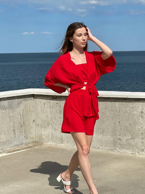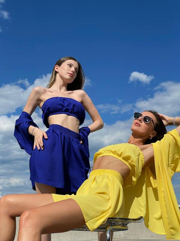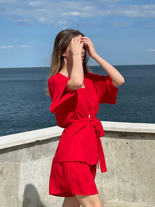 Костюм 3ка #2877Шорты, топ, кофта кимоно.one size Ткань креп-шифон Кофта от плеча 48см, от плеча 70смШорты 43 см талия 64 до 86, по бёдрам расклешенное 115см.
