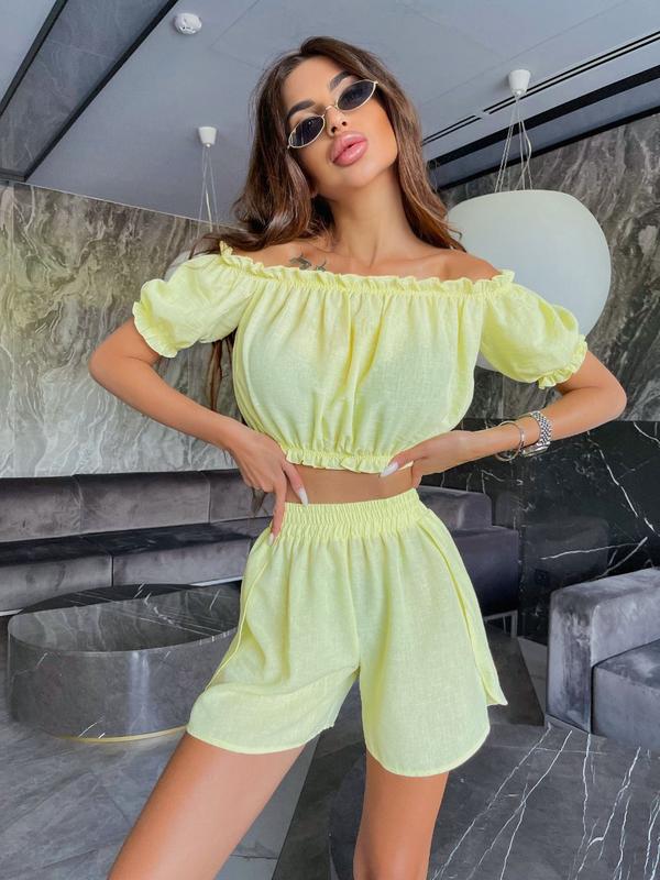 Костюм двойка топ+шорты,выполнен из натуральной ткани, летний лён,не парит, лёгкий,приятный к телу, будет не заменимым в вашем гардеробе❤️❤️❤️