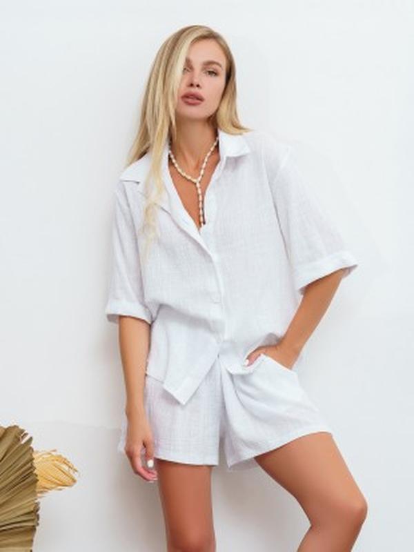 Костюм. Бавовняний костюм з сорочкою та шортами Розмір: S, M, L, XL Колір: бузковий,білий,зелений,голубий Матеріал: Котон Склад: 100%, бавовна Бавовняний літній костюм із шортами вільного крою. Сорочка на ґудзиках із прямим кроєм та коміром. Модель з короткими рукавами та підворотами. Короткі шорти на гумці оснащені кишенями. 13458