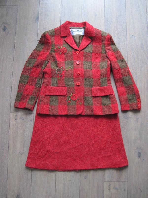 Винтажный костюм, сделан в Италии указан размер 46, по замерам подойдет на М Замеры пиджака: Длина 62 см ширина плеч 42,5 см Полуобхват груди 50 см Полуобхват талии 45 см Полуобхват снизу 54 см Длина рукава от плеча 56 см. Замеры юбки: длина 70 см полуобхват талии 38 см полуобхват бедер 57 см Полуобхват снизу 67 см цвет красный с хаки 45% шерсть, 40% акрил, 15% полиамид подкладка - 60% ацетат, 40% вискоза состояние отличное, без дефектов