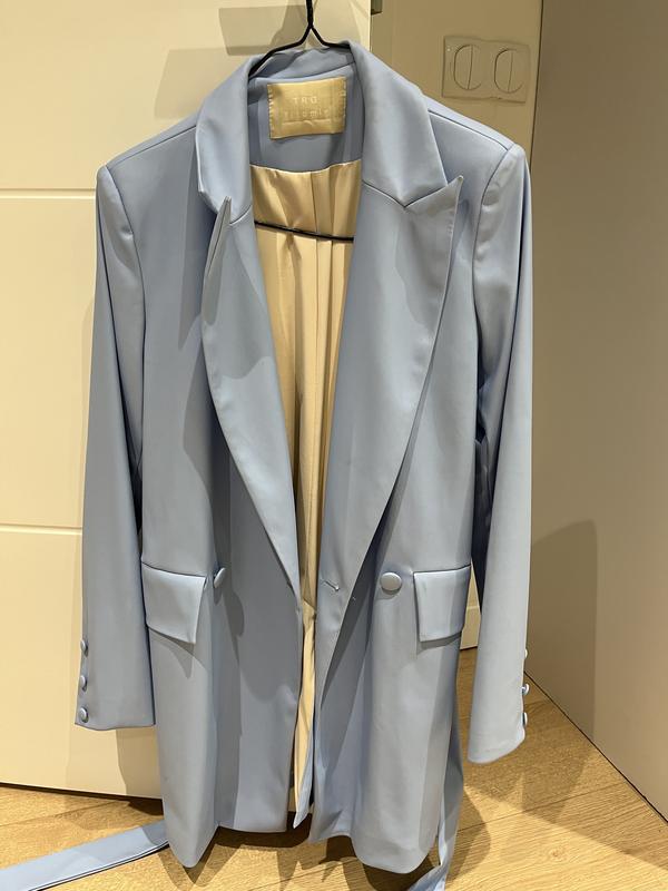 Костюм ніжно-блакитного кольору в розмірі s.Короткий топ на брателькмх, юбка з високою посадкою і довгий піджак .