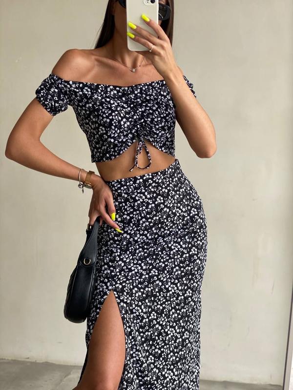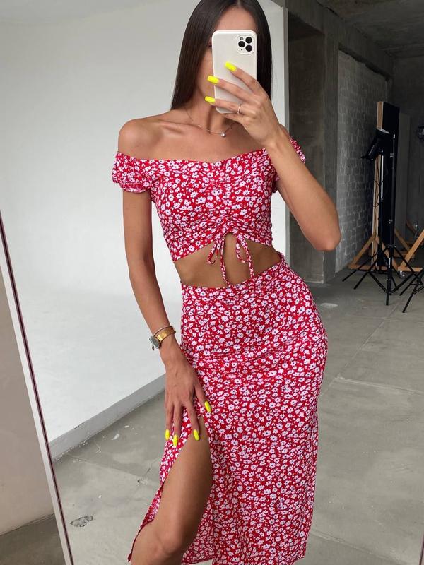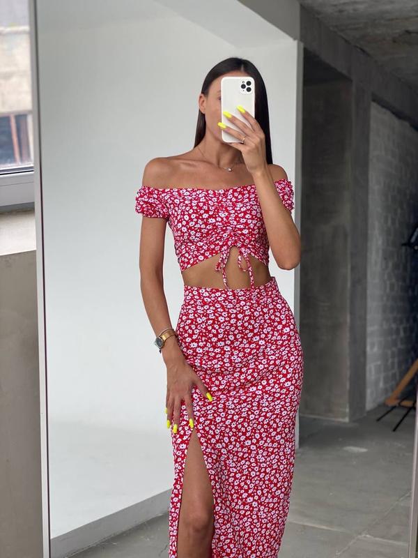 Размеры 42-44, 46-48 Тканина : софт Цвета: черный, красный Легкий и стильный костюм, юбка сзади застегивается на молнию, топ на груди затягивается! Отличное качество!