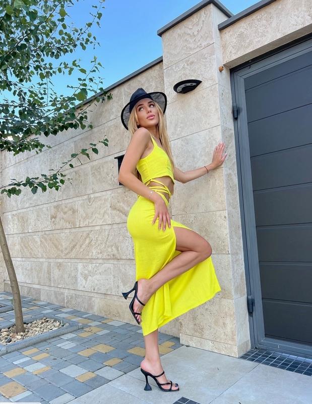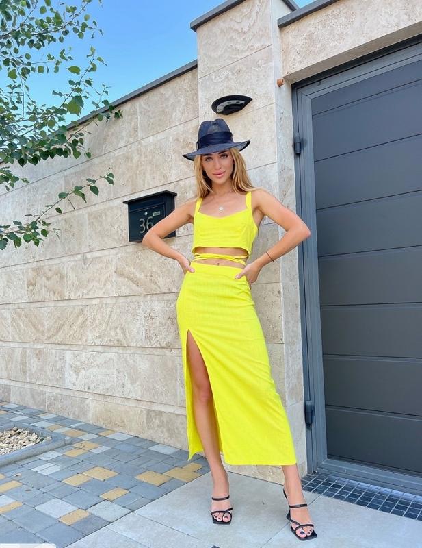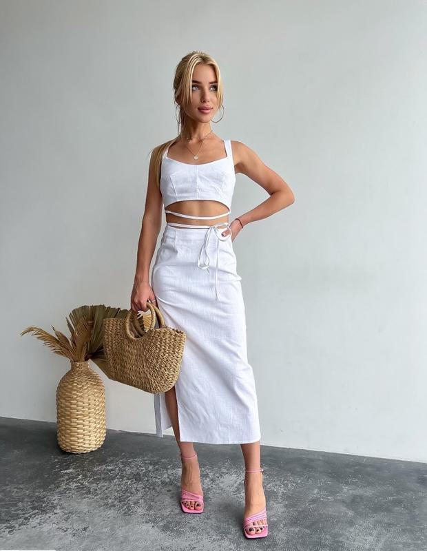 Костюм топ с юбкойТкань: лёнЦвет: черный / белый / зеленый / желтый / голубой / салатОсобенностиРазмер: 42-4444-46