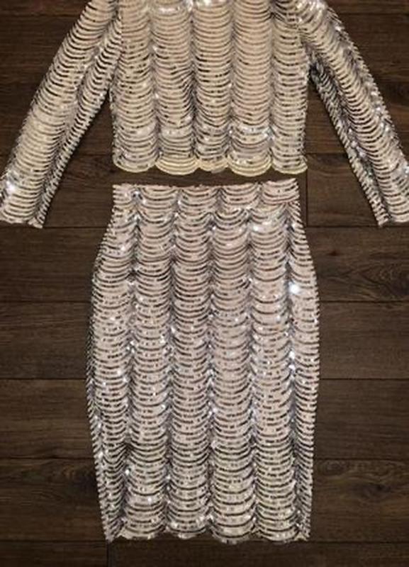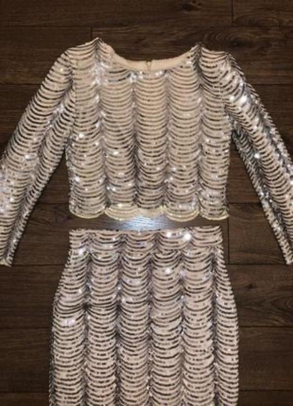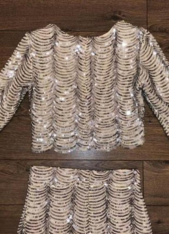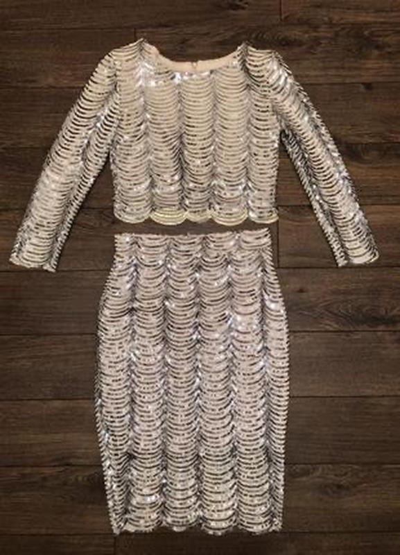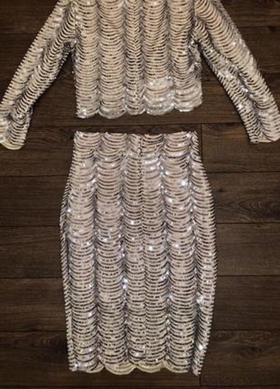 Костюм бежевого цвета, полностью вышит полосатыми паетками(92% полиэстера, 8% эластана, подкладка полиэстер). Основная ткань -тоненькая бежевая, стрейчевая, в обтяжку, а верхний слой - прозрачная сетка, полностью расшита пайетками, сетка тоже стрейчевая. Топ - на подплечниках. В жизни выглядит круче фото. Легкий. Длина топа 40см, ПОГ 44см-46см,ширина плеч 38см, длина рукава 51см,сзади потайная молния. Длина юбки 62см, ПОТ 34см-36см, сзади потайная молния, ПОБ 44см-46см, к низу заужена. Производство Великобритания.