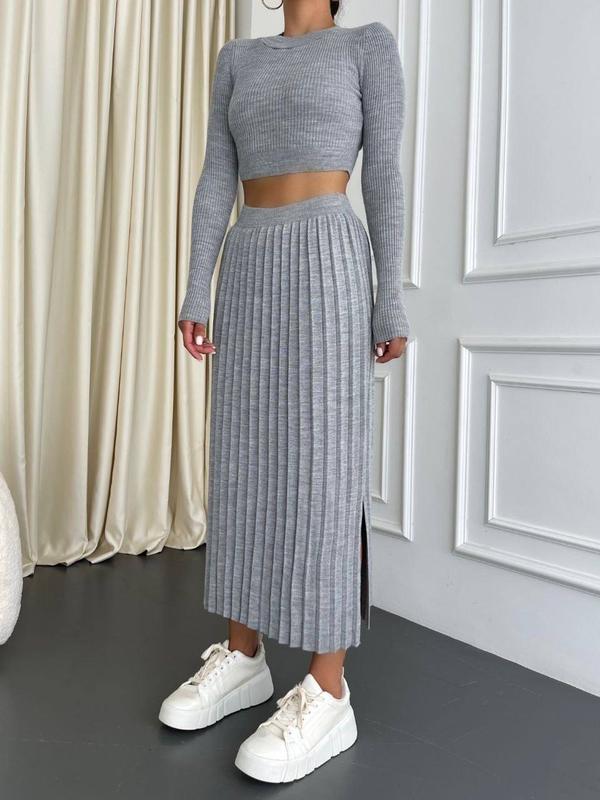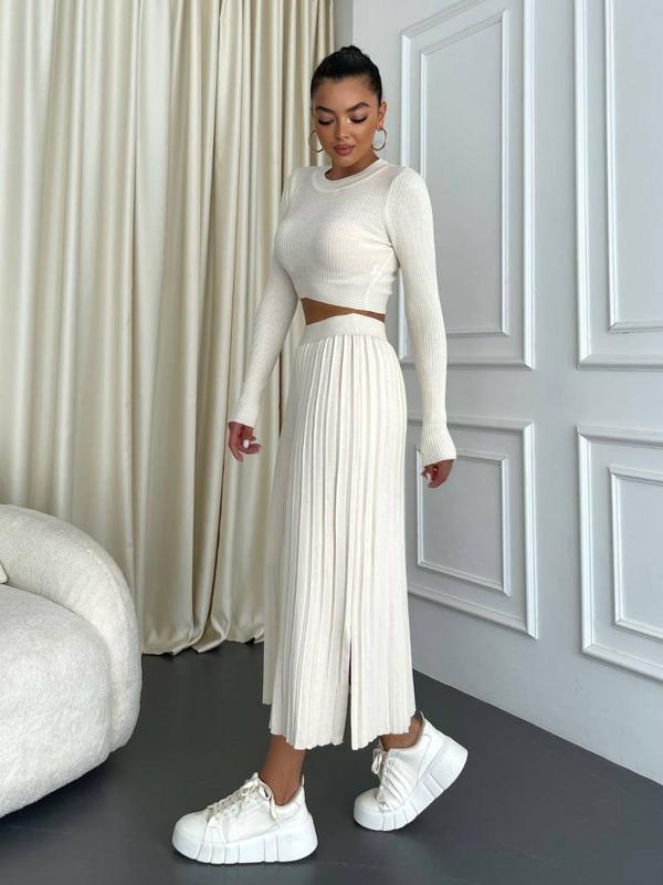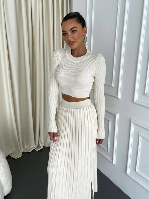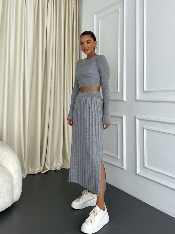 Трикотажный костюм представлен с плиссированной юбкой максы и укороченным лонгсливом. Такой комплект гармонично вписывается в образ как основа, так и в качестве отдельных элементов.