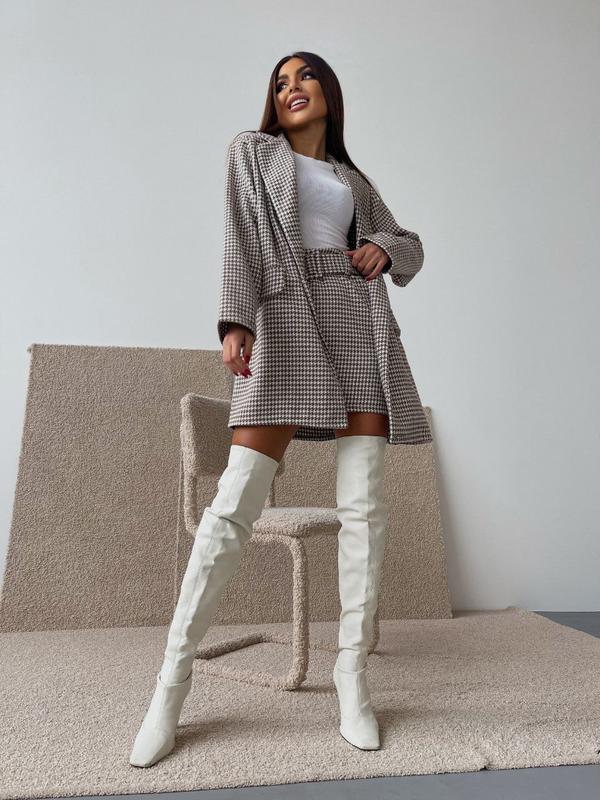 Костюм (пиджак+ юбка) ремень обтянут тканью идет в комплекте №606/14 Ткань: качественный турецкий твид Размеры: 42-44, 44-46 Цвет: бежево-белый, принт гусиная лапка 🏷️Цена: 1220 грн. Пиджак оверсайз на пуговицах, длина от плеча 83 см, ОГ-56 см, ОБ-58 см, Длина рукава от плеча 60см Юбка ( на молнии) ✅Размер 42-44 Длина 42 см, ОТ-35см, ОБ-46 см Юбка (на молнии) ✅Размер 44-46 длина 44 см, ОТ-38см, ОБ-49 см