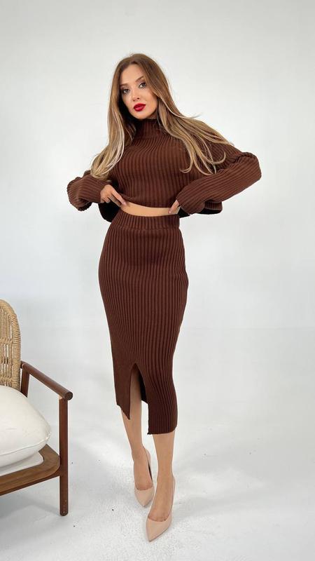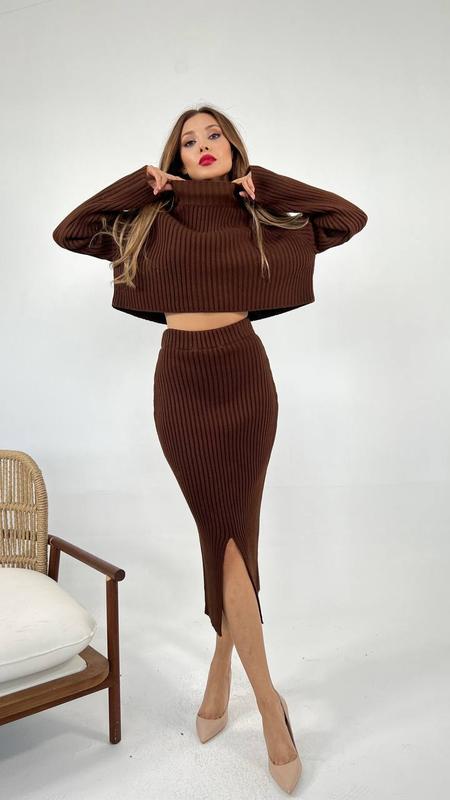 Трикотажний комплект включає приталену спідницю міді та кроп-топ з коміром-стійкою. Для зустрічі з подругами, побачення або особливого випадку поєднуйте костюм з босоніжками на платформі та об'ємним клатчем.