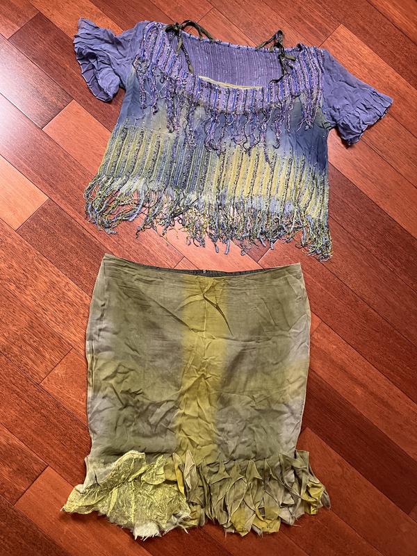 Надзвичайно оригінальний і ніжний костюм, пошитий під індивідуальне замовлення львівського дизайнера Оксани Караванської. Ручна індивідуальна робота під замовлення. Дизайнерська креп-шифонова тканина,якї немає у продажі. Розмір на ХХЛ- ХХХЛ, дивіться по замірам. Футболка: плечі 53, ог 59, рукав від шва 25, довжина по задній стороні уся з вісюльками 61 Майка: плечі 41, ог 58, довжина 50 Спідниця: талія 53, бедра +/-59 см, довжина уся максимальна 68, довжина підкладки 50 см Стан дуже гарний, окрім незначних нюансів на фото. Фурнітура ціла. колір неймовірний Про сам фасон коментарі відсутні, ви самі бачите унікальність фасону і оригінальність.