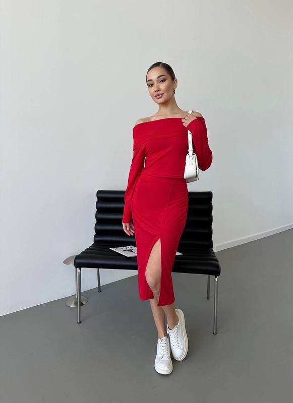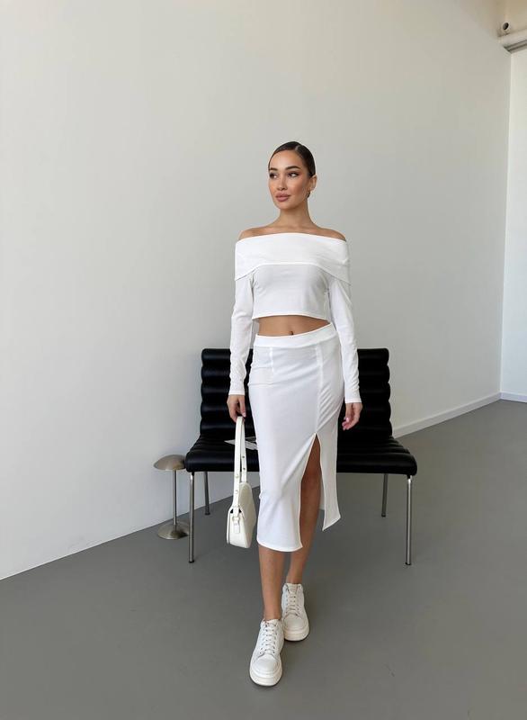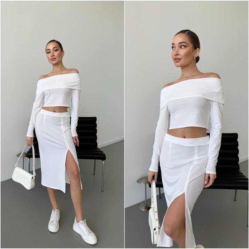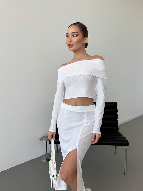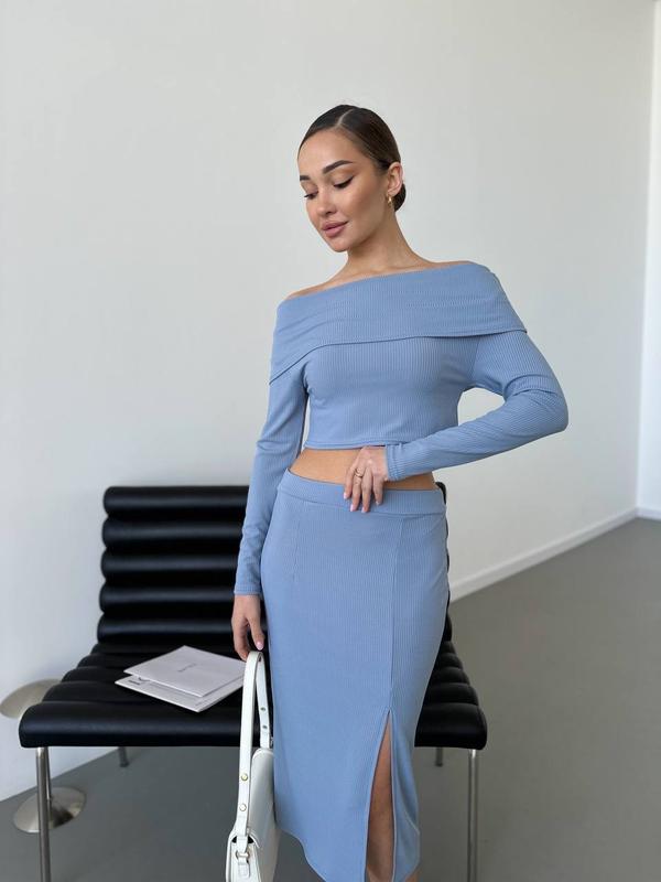 Костюм двойка с юбкой станет идеальным нарядом на весенне - летний период. Приятный и удобный. Юбка длины миди дополнена сексуальным разрезом от бедра, а укороченный лонгслив с открытыми плечами идеально подчеркивает красоту женских ключиц. Плюс вариативность и комбинаторность такого комплекта в сочетании с большинством вещей вашего гардероба делает его вообще невероятным