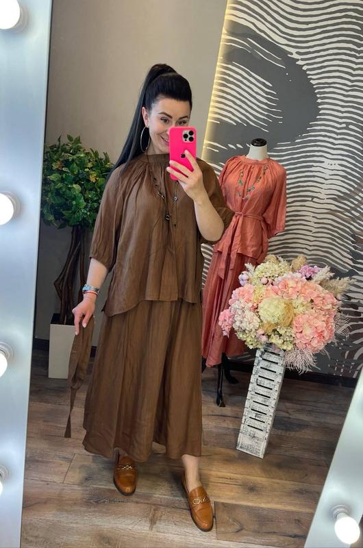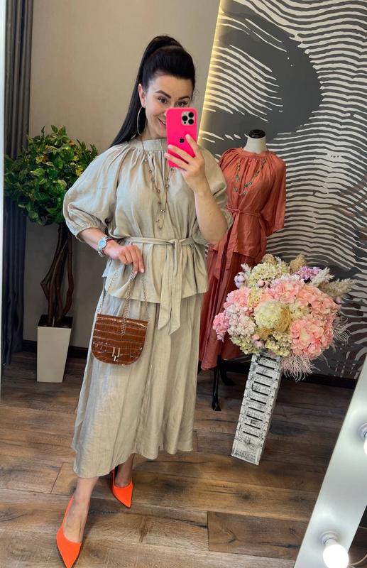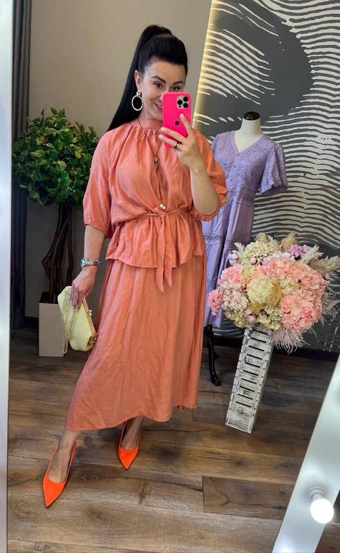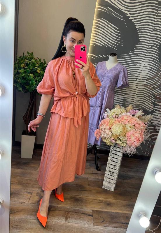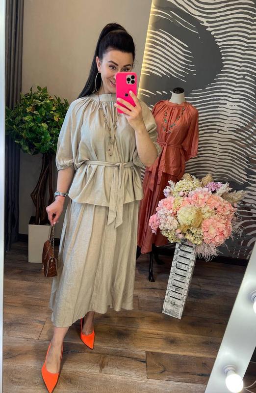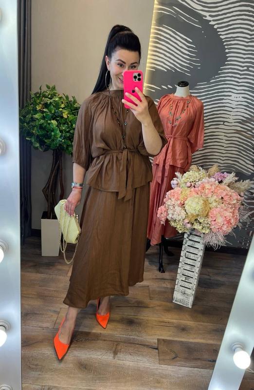 яркий запоминающийся костюм с первой минуты попадает в наши сердца и гардеробы, он невероятно красивый и уютный, блуза свободного кроя с небольшим воротником стойка, короткими рукавами, разрезами по бокам и поясом в комплекте, дополняет стильная юбка миди без подкладки, слегка удлиненная по бокам, на резинке вверху