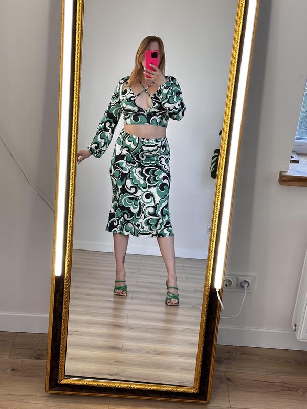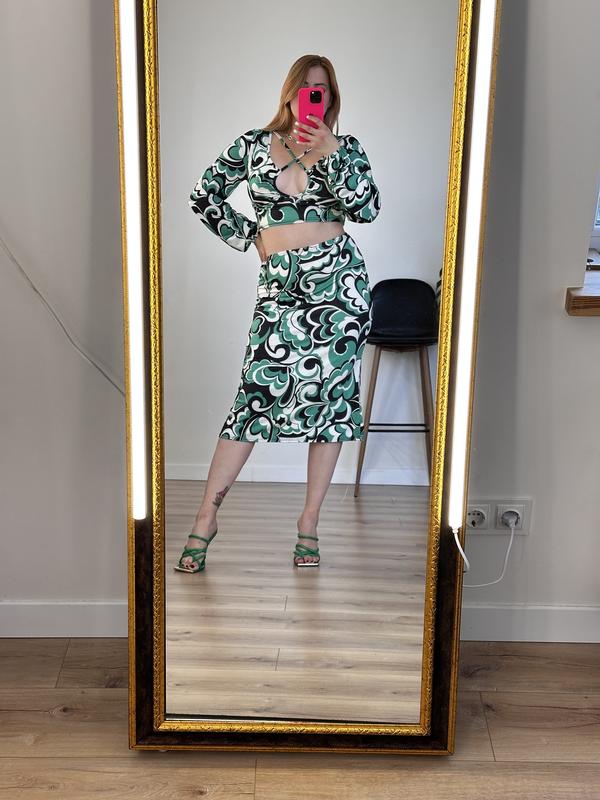 Новый летний костюм. Ткань очень хорошо тянется, приятная к телу. Параметры на фото: рост 168, 104/77/106 ( сидит свободно) . Длинна юбки 74 см. Полуобхват талии 38 см. Полуобхват груди 45 см. Полуобхват рукава 16 см, Длина 60 см
