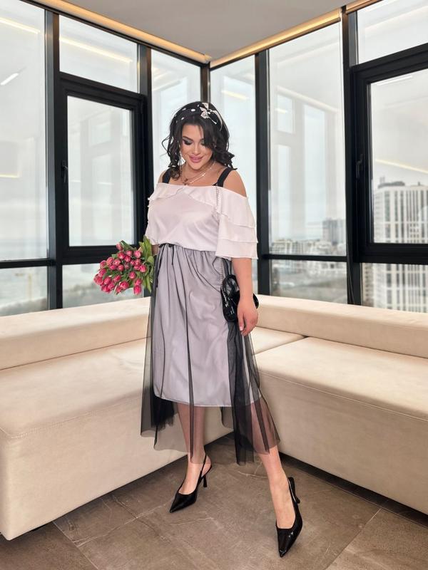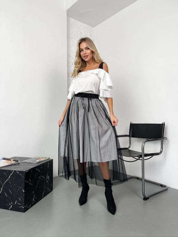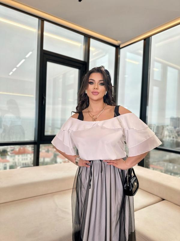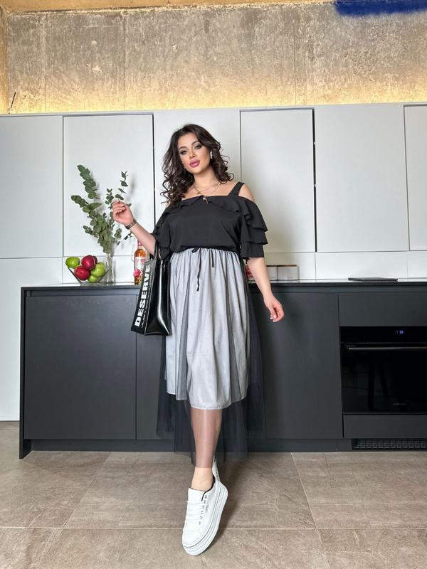 Юбка: подклад из софта, сверху евросетка, пояс на резинке плюс шнурок. Блузка свободного кроя со спущенными плечами.