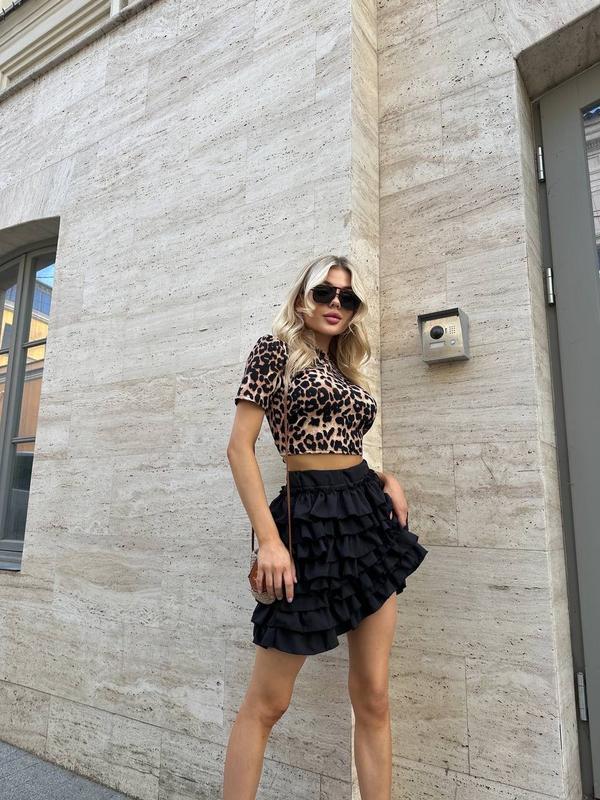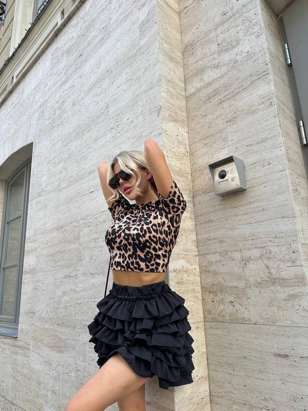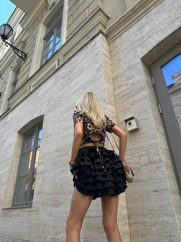 Юбка йде воланами, за рахунок цього талія буде виграшно виглядати , топ позаду з вирізом та завʼязками . Він неймовірний 🩷