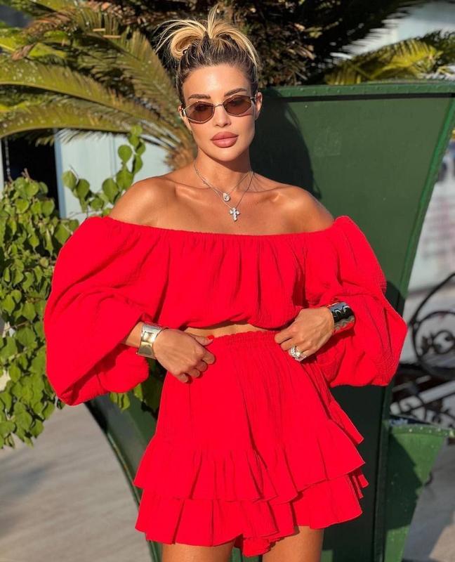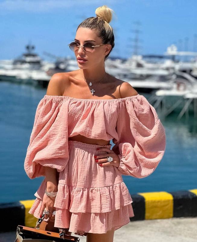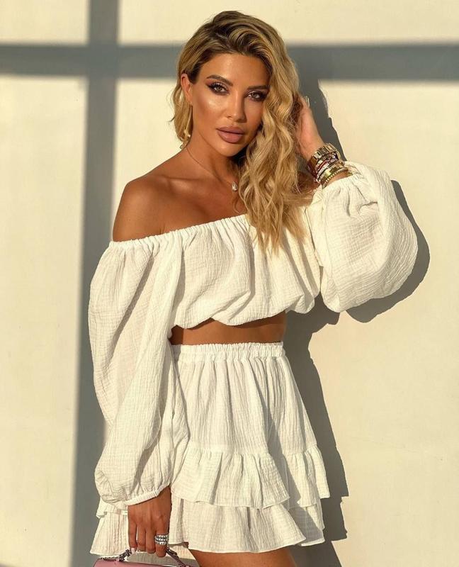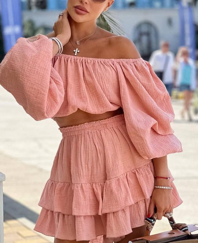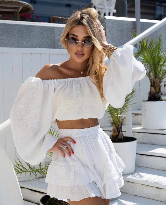 Костюм(блузка + юбка)№626Цена: 670грРазмер универсальныйДлина верха-31см, ОГ 50-52смДлина юбки-40см, ОТ-48-50см, на поясе резинкаТкань: муслин