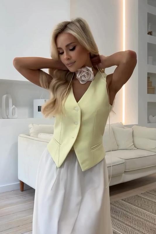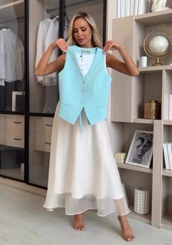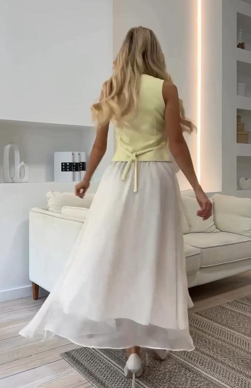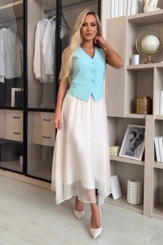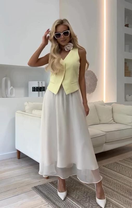 Ткань : жилет - костюмка, юбка - шифон + подкладкаРазмеры : 42-44, 46-48Цвета: желтый, ментол