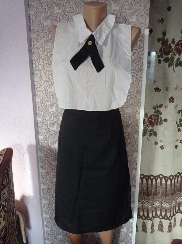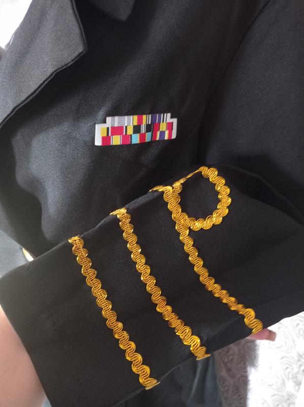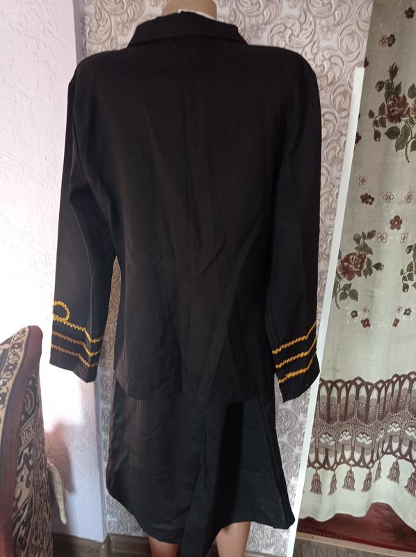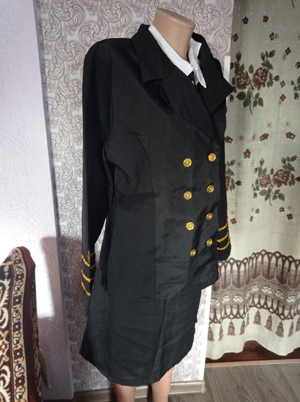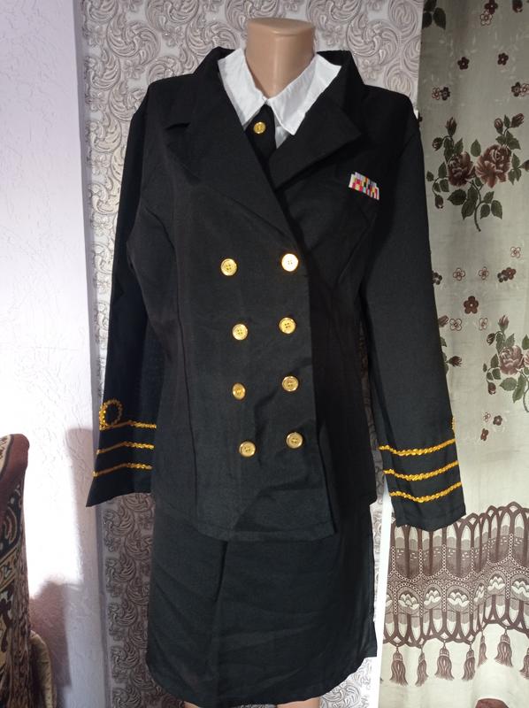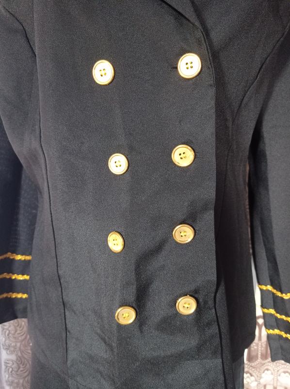 Военно-морской костюм чёрного цвета состоит из пиджака и юбки.Пиджак застегается на пуговицы.Юбка на талии на резинке.Застегается на молнию.