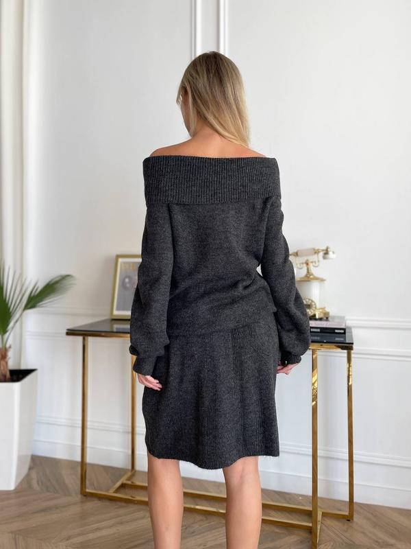 Комплект из приятного к телу трикотажа включает свитер с открытыми плечами и длинным рукавом и юбка прямого кроя.