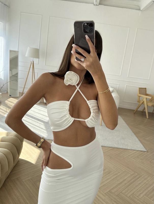 Стильний білий костюм з вирізами та укороченими топом та вирізом
