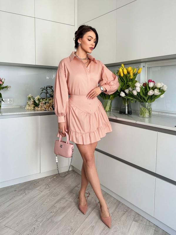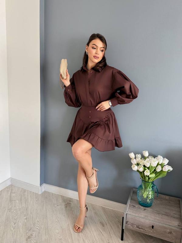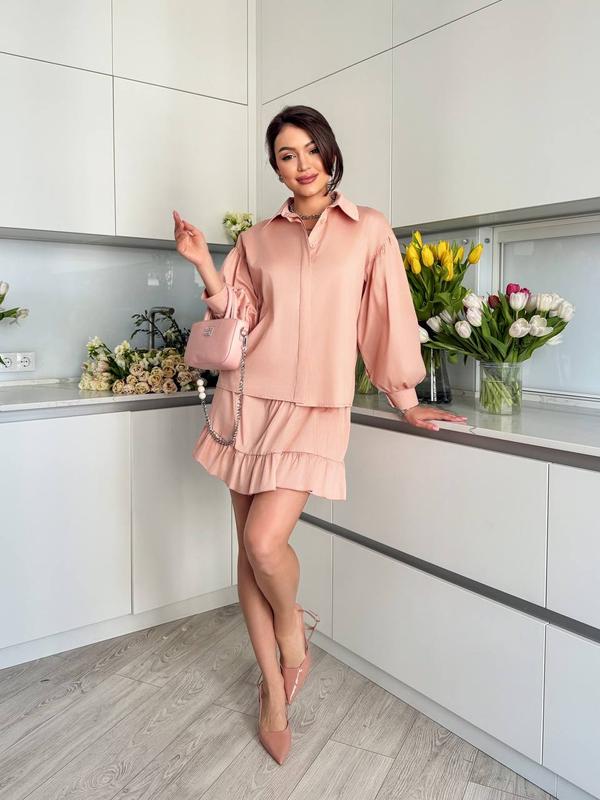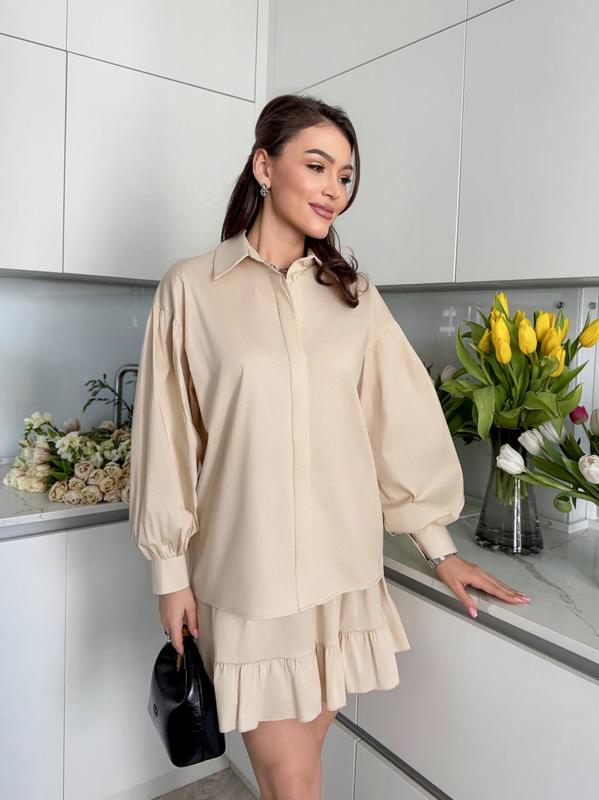 Комплект состоит из рубашки с двойной планкой спереди, застегивается на пуговицы